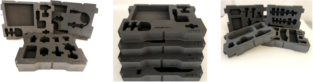 Condiviso e approvato con il cliente questo approccio, il cliente ci ha inviato fisicamente tutti i componenti, da questi il nostro ufficio tecnico è partito facendo tutti i rilievi e disegnando le sagome di ciascun alloggiamento, i vani avrebbero dovuto essere avvolgenti per proteggere adeguatamente i pezzi e facilitare con la forma oltre che con il numero il posizionamento.